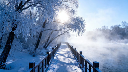 AI Generated. Frosty Reflections on a Shimmering Surface in Winter Landscape