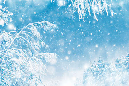 Tree branches in winter covered with snow and frost in snowfall on blue sky background. Frozen tree branches. Snow covered branches in winter forest. Magic white background.