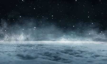 Dark abstract winter forest background. Wooden floor, snow, fog. Dark night background in the forest with moonlight. Night view, magic. Fantasy forest.