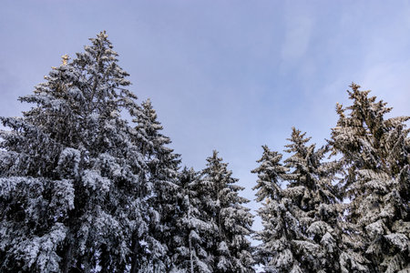 Bottom view of trees covered with snow in beautiful winter woods and sunlight