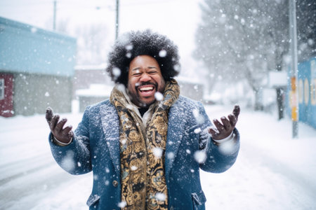 Joyful man with afro enjoying snowfall in city.
