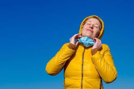 Close up portrait of a satisfied girl taking off his medical mask and inhaling fresh clean air on an open-air street during a coronovirus quarantine pandemic.