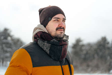 A young man smiles in a snowy winter forest. A guy walks outside in a park. Portrait of a man in the fresh air in winter. An active lifestyle in winter during vacation or holidays