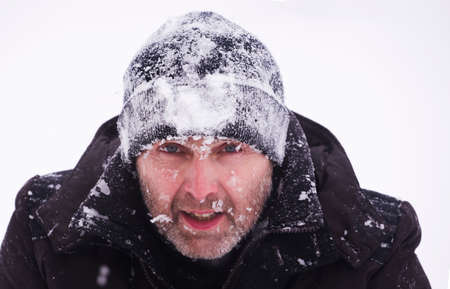 Close-up of a man's face covered in snowflakes during a winter snowstorm