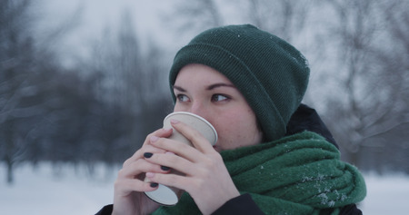 teenage girl drinking hot cocoa in park on a winter day