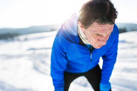 A senior man standing after the run in winter nature.