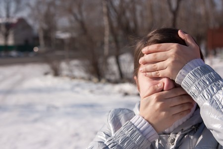 Young adult female covering mouth and from eyes her palms