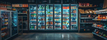 A well-organized refrigerated aisle in a modern grocery store, featuring neatly stocked shelves with a variety of food products. The clean and efficient layout is ideal for themes related to retail, shopping, and food choices.