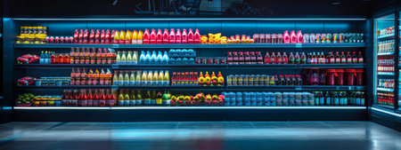 A brightly lit grocery store aisle with shelves stocked full of colorful drinks and fresh produce. The organized display and vibrant lighting emphasize the variety and freshness, perfect for retail and consumer-related themes.