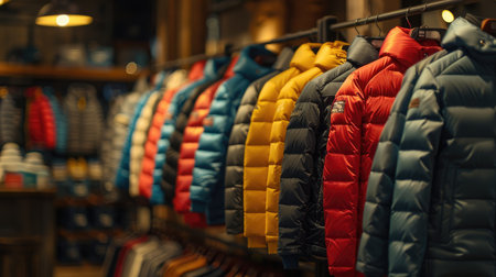 Collection of winter jackets in clothing store.