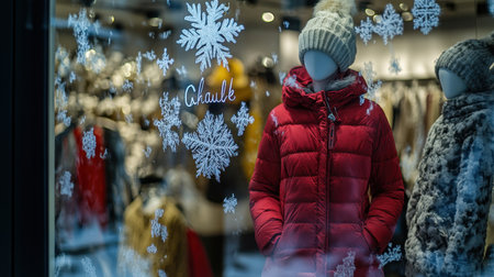 Frosted glass window showcasing mannequins dressed in stylish coats, with a bold SALE sign and a cozy winter ambiance