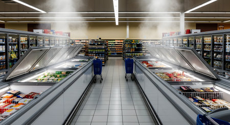 A wide-angle view down a brightly lit frozen food aisle in a modern supermarket or grocery store. Rows of glass-topped commercial freezers are filled with various frozen products, and vapor rises from them. The perspective shot conveys a sense of abundance and consumer choice.