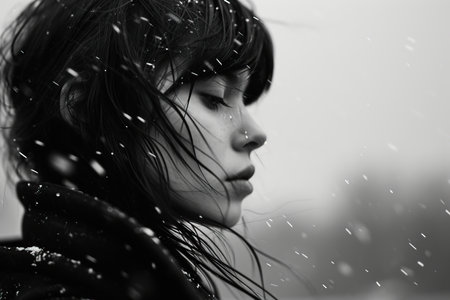 A woman with black hair stands in the rain, her hair blowing in the wind