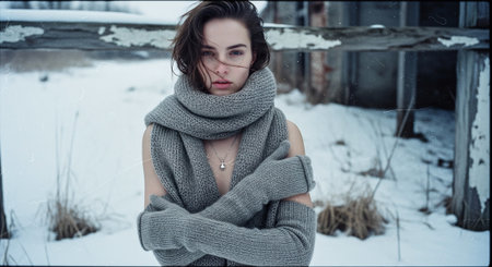 Portrait of a beautiful young woman in a gray sweater and scarf.