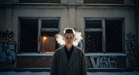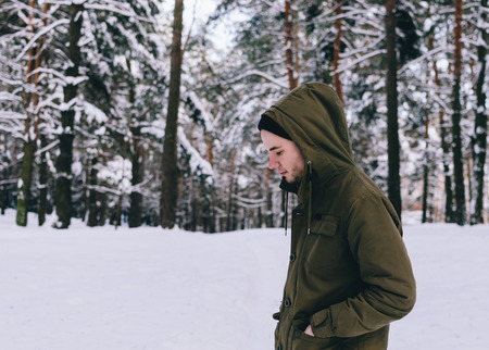 Young man in winter clothes in snowy night. Mixed media. Mixed media