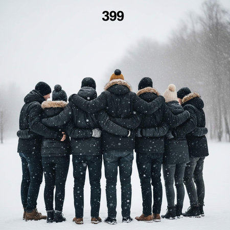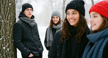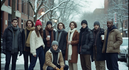 A group of young adults standing together in a snowy urban setting, dressed in winter clothing, with some holding coffee cups, showcasing a cozy winter atmosphere