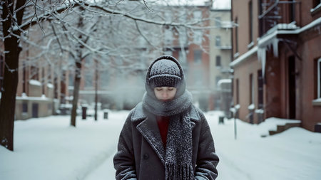 A young man bundled up in a warm winter coat scarf and hat braves the snowy cold weather outdoors