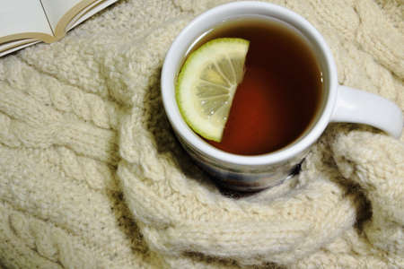 Christmas cup of lemon tea in the handmade woolen blanket and a book