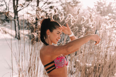 Cold winter day girl in bikini doing sefi phone. Woman hardens the body in cold weather. Good immunity is protection against many diseases. Brown color filter