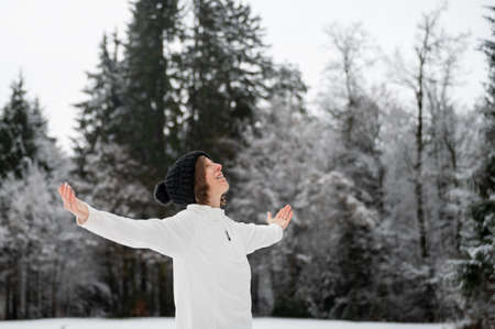 Happy peaceful young woman standing outside in a snowy winter nature enjoying life with her arms spread widely.