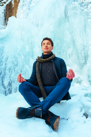 Chilly winter air surrounds a young man enjoying a refreshing ice bath outdoors in nature.