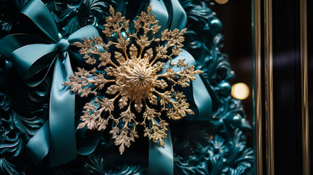 Christmas decoration details on English styled luxury high street city store door or shopping window display, holiday sale and shop decor inspiration
