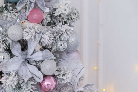 Beautiful silver Christmas tree with decorations. New Year 2020