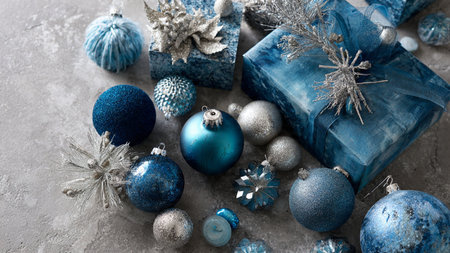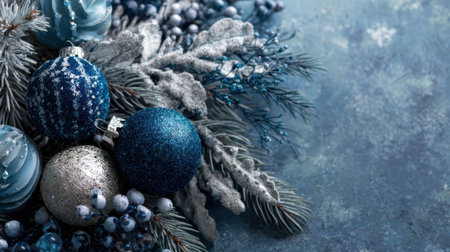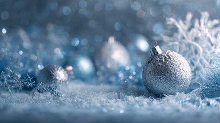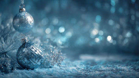 Sophisticated Christmas background showcasing silver decorations on icy blue textures with a refined winter mood.