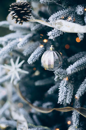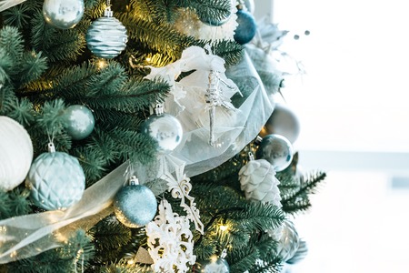 Closeup of beautiful Christmas silver ornaments hanging on Christmas tree on window background. Christmas winter solid silver-blue background. The Concept Of A Happy Christmas