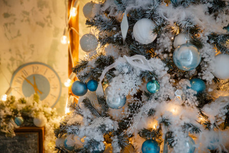 Christmas tree toys decorations and snow-covered Christmas tree branches close-up. Winter Christmas New Year background.