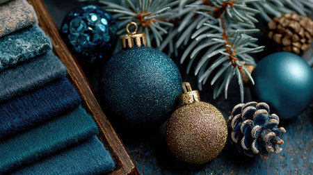 This captivating arrangement showcases various textiles in rich blues alongside shimmering ornaments and natural pinecones, evoking a festive holiday spirit.