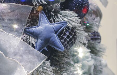 Close-up of toys on the Christmas tree. Artificial Christmas tree and star. New Year card