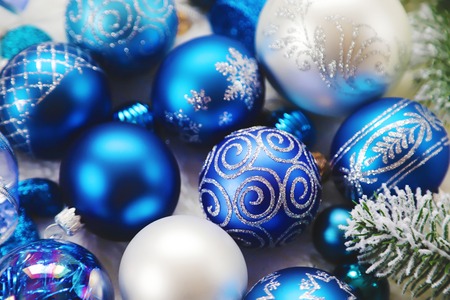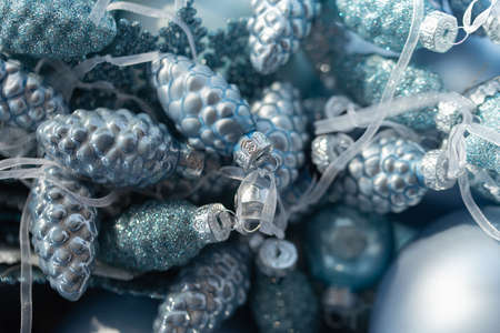 macro blue Christmas toys background. Preparing to decorate Christmas tree. New Year decoration. Festive holiday mood. Selective focus. Christmas card.
