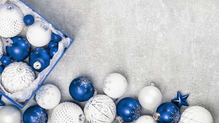 Blue and white Christmas baubles in a box flat lay on gray table. Merry Christmas and Happy New Year seasons greetings card. Copy space. Festive border banner