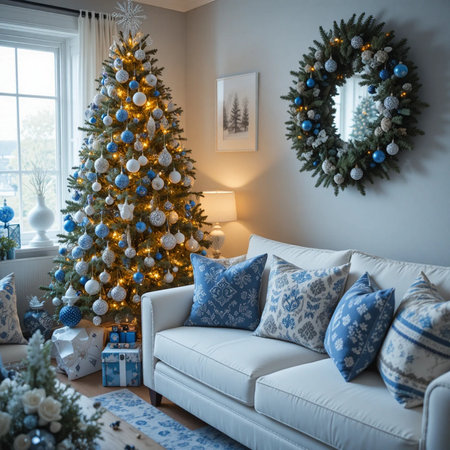 A modern minimalist holiday setup featuring blue-and-silver d