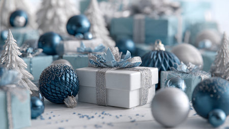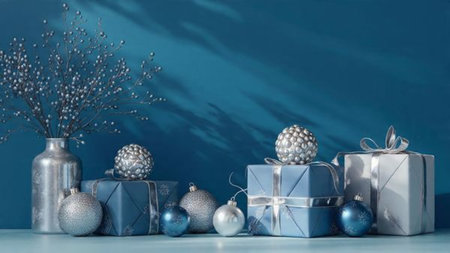 Blue monochrome design featuring smooth gift boxes contrasted by shiny silver ribbons and ornaments.