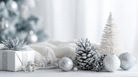 A beautifully arranged festive composition featuring silver ornaments, pine branches, and elegant gift boxes on a soft backdrop, perfect for enhancing holiday themes and moods.