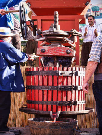 Chusclan village, France - October, 13th, 2012: traditional Wine Pressing using a manual grape crushing machine during 14th festival grape harvest of the history, Chusclan, France.