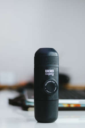 An Illustrative editorial of the Wacaco Minipresso machine in which you can make expresso coffee on the go in an home office background.