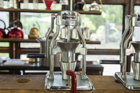 Waiter squeezing the coffee in the percolator at the coffee shop