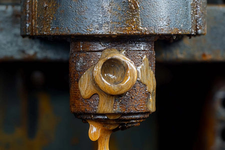 Rusty machinery dripping with amber liquid in an industrial setting. Generative AI
