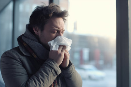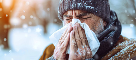 A man appears unwell with a cold, bundled in warm clothes and using a tissue to blow his nose during winter.