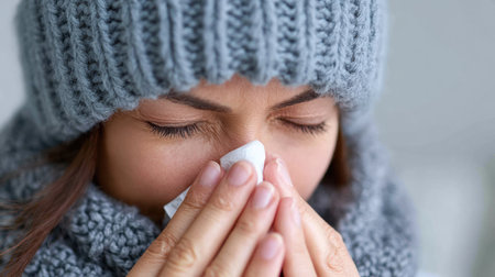 A woman in a cozy knitted hat blows her nose while sitting indoors, highlighting her discomfort during a chilly season.