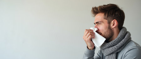 A man holding a tissue to his nose, wearing a grey scarf and sweater, sneezing, isolated on a light background. Concept of cold or flu. Copy space.