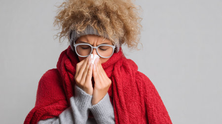 A young woman with blonde curly hair and glasses wrapped in a warm red scarf blowing her nose with a tissue, illustrating seasonal flu or cold symptoms.