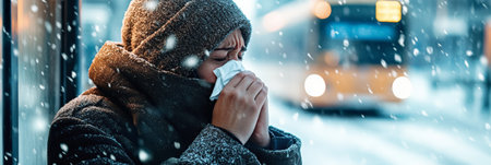 Sick woman blowing her nose while waiting for the bus at the bus stop under a heavy snowfall, suffering from illness, flu, or cold during winter