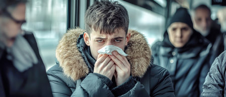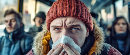 As the winter chill settles in, a young man battles a cold, sneezing into his handkerchief on a crowded bus. Fellow passengers look on with stern expressions.