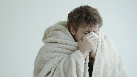Man suffering from cold blowing nose into tissue, providing ample space for text overlay