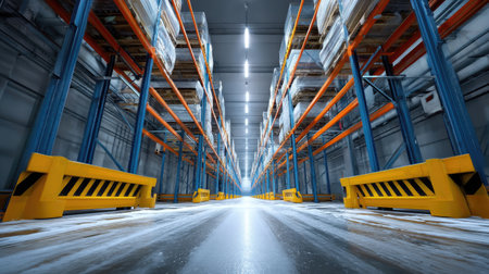 Explore a spacious warehouse interior with high pallet racks and safety barriers, showcasing an organized environment ready for efficient storage and distribution operations.
