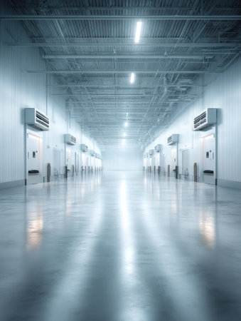 Brightly lit industrial hallway features smooth flooring, multiple doors lining the sides, and a spacious, clean atmosphere in a contemporary setting.